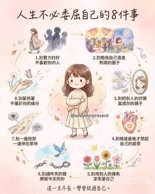📌 人生不必委屈自己的8件事,你做了幾件事? 人生很短,但我們卻常常把大把力氣花在討好不在乎我們的人、硬擠進讓自己疲憊的圈子,或拿別人的尺子來量自己的價值。 今天,我只想提醒:你不需要背叛自己才值得被愛。 想想看,費力討好一個早已不喜歡你的人。每一次陪笑、每一句迎合,最後只換來空虛。真正的關係,從來不用你縮小自己。同樣,硬要融入熱鬧的圈子,往往比獨處更寂寞。歸屬感不是演出來的。 我們也常把別人的價值觀當成自己的鏡子。看別人的成就、伴侶、物質,然後照出自己「缺少什麼」。但那面鏡子是騙人的。你的路是你的,別人擁有什麼,不代表你比較差。至於昨天的錯誤?那是功課,不是無期徒刑。一直抓著愧疚和後悔,只會讓今天的你走不動。 更重要的是,許多人總是把「自己的感受」排在最後,也習慣用抱怨來為自己的停滯找理由。其實,照顧好自己的心情不是自私,而是必要的事。發洩情緒沒問題,但如果只會抱怨卻不行動,痛苦就會像一間沒有出口的房間,把你困在裡面。 最後,別再緊抓不屬於你的緣分。人、機會、過去的某個版本,抓太緊,痛的是自己的手。這一生真的不長。放下委屈,選擇平靜多於討好,自由多於硬擠,善待自己多於無止盡比較。這不是放棄,而是真正的長大。。