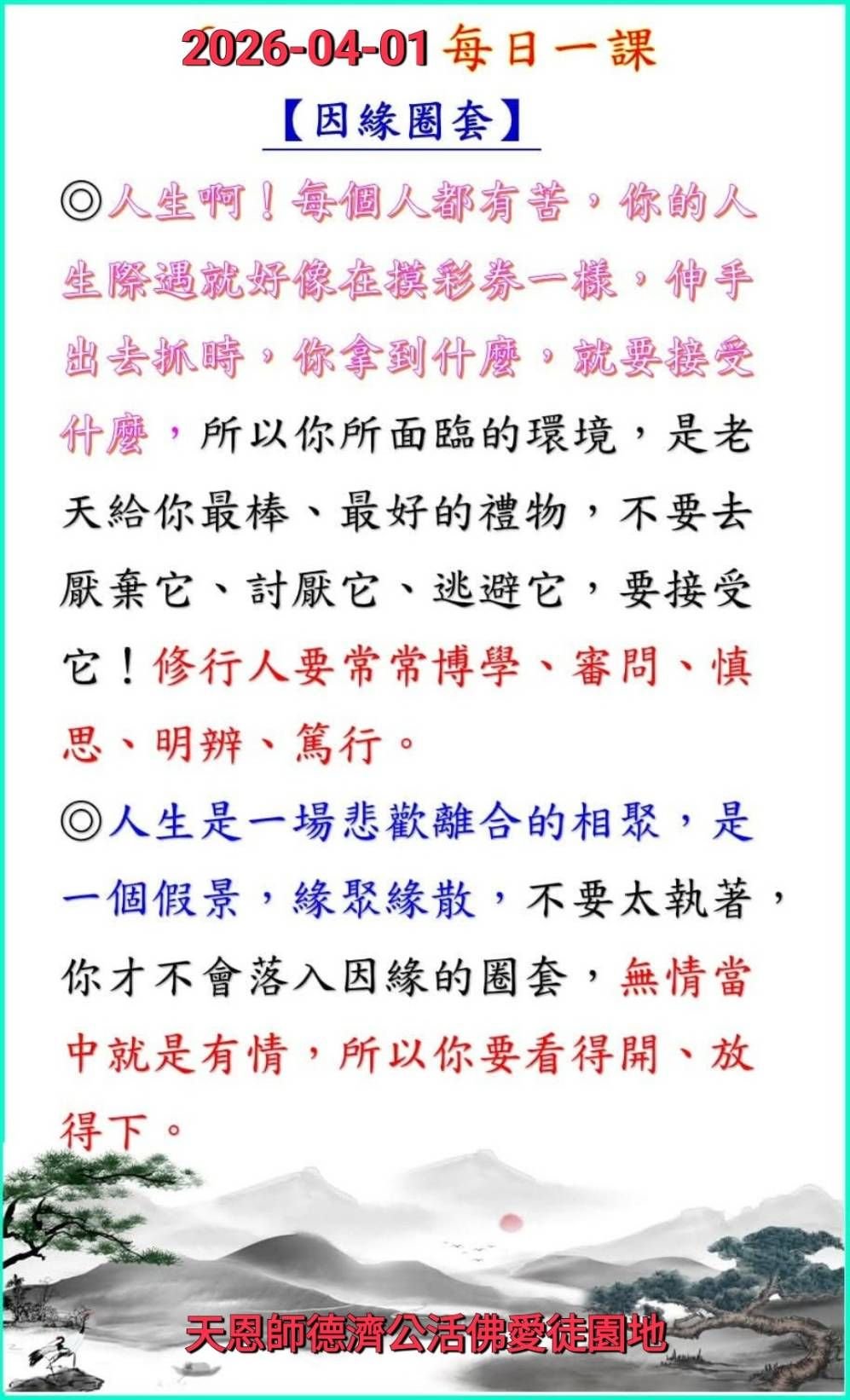 ◎人生啊!每個人都有苦,你的人生際遇就好像在摸彩券一樣,伸手出去抓時,你拿到什麼,就要接受什麼,所以你所面臨的環境,是老天給你最棒、最好的禮物,不要去厭棄它、討厭它、逃避它,要接受它!修行人要常常博學、審問、慎思、明辨、篤行。 ◎人生是一場悲歡離合的相聚,是一個假景,緣聚緣散,不要太執著,你才不會落入因緣的圈套,無情當中就是有情,所以你要看得開、放得下。