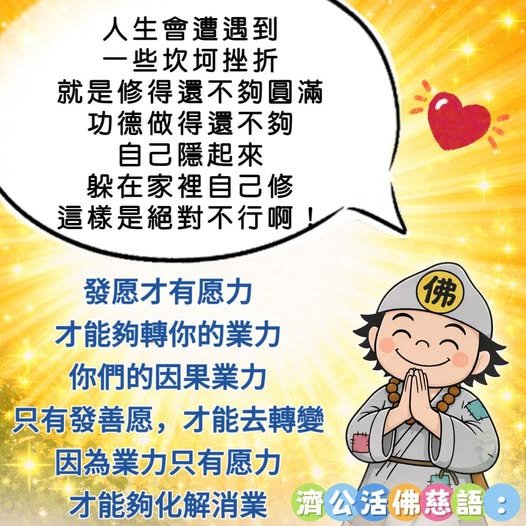 #人生的坎坷與挫折 從來不是無緣無故 而是因果的顯現 是業力的提醒。 修得不夠圓滿 功德不夠深 才會在人生路上處處受阻。 但很多人選擇 躲起來,自己默默修 以為這樣就能改變一切 其實不夠。 沒有「發愿」 就沒有力量去轉動命運。 唯有發出真心的善愿 為眾生、為他人、為正道 愿力一出 才能帶動改變。 業力不是不能消 而是需要更強的力量去轉化它。 這個力量,就是「愿力」。 當你的愿越真、越大、越堅定 你的路 就會慢慢被改寫。