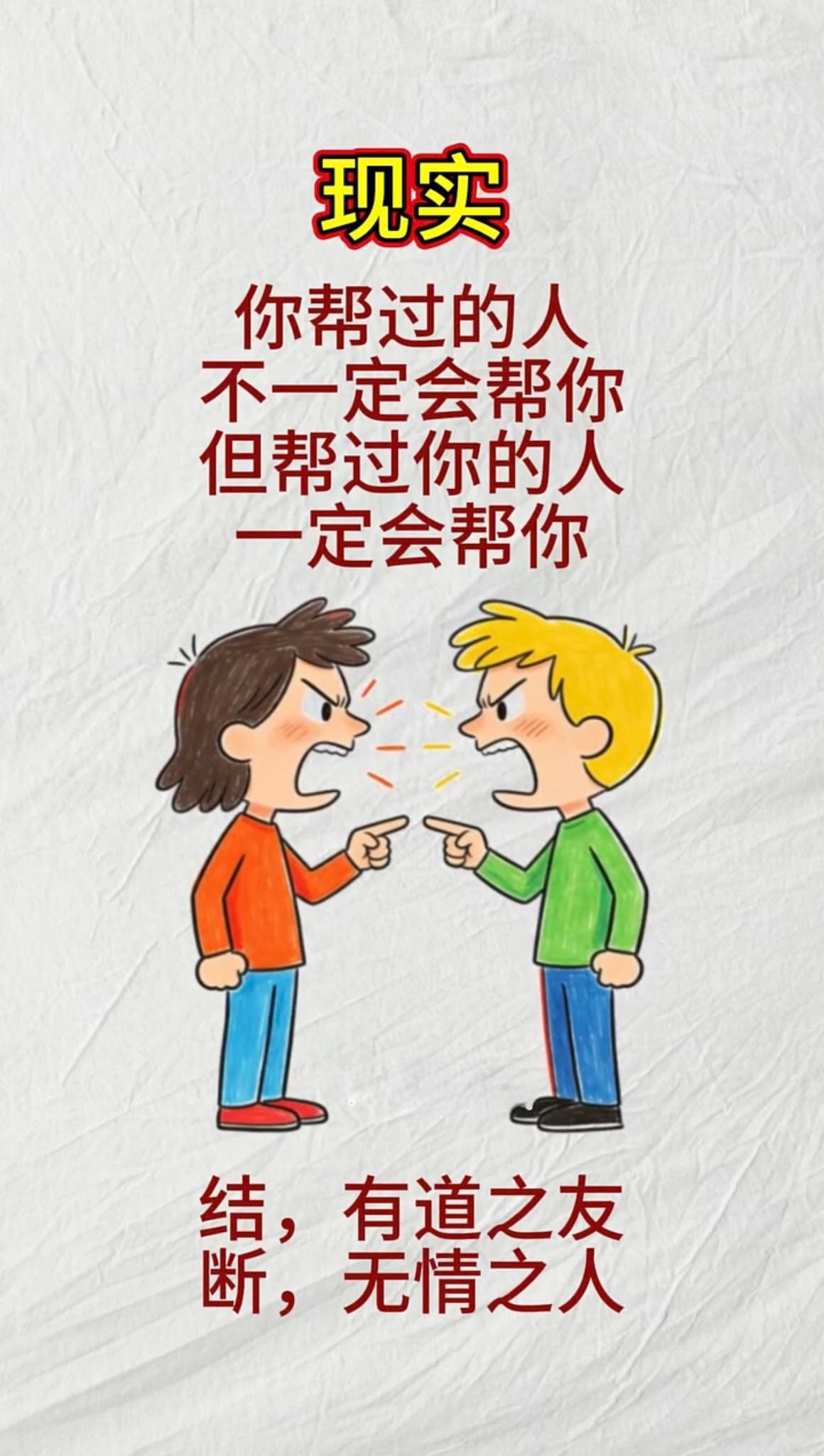 你帮过的人,不一定会反过来帮你; 但曾经帮过你的人,往往还会再帮你。 原因很简单: • 愿意帮你的人,本身就是热心、重情、靠谱的人,本性如此。 • 你帮过的人,可能只是受过你的恩惠,不代表他也愿意付出。 績,有道之友 对你有恩情、真心帮过你的人,要珍惜、继续深交,这是“有道”的真朋友。 断,无情之人 受过你恩惠,却冷漠无情、不懂感恩的人,该疏远、断掉往来。 整段话的意思: 识人要看他是否愿意主动帮你,而不是你帮过他多少; 知恩图报的人深交,无情无义的人远离。