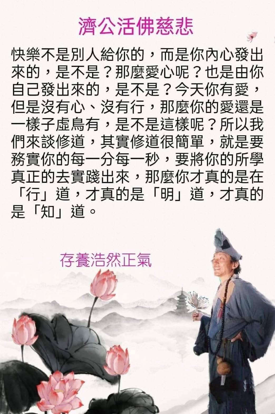 濟公活佛慈訓【一行三昧:直心、直言、直行】 ◎今天為師要對徒兒説:無論你身份有多高, 還是有多平凡,跟為師學道的人,切記不要用彎曲心。 你對任何人,都應該直心、直言、直行,不要心裏盡來回轉彎抹角的,在你的心裏,有很多彎彎曲曲的事情:應該直心。 『直言』,就是你心裏想的,你口裏就説。 不是説我心裏想東,我口裏就説西;我心裏想西,口裏說東, 心口不如一,這就不直了!你心和口,要一樣的。 徒兒啊!所謂直言,做事情也直,説話也直。 説出話來,沒有委曲婉轉的機謀智巧,所行所作都要直的, 所謂『直心是道場』。其心不直,你這因不直,將來你果 也不直;所以必須要行住坐臥,純一直心。 怎麼叫『純一』呢?就是精純到極點, 就是一個了,絕對沒有兩個。 『精純』到一個是什麼呢?就是直心。 我們修道的人,無論對人、對己、對事、對什麼, 都要有直心,不要盡心裏總計算人:那個人有錢, 我和他借一點來,我自己用一用。 就是窮到極點,也不要做這種沒有廉恥的事情。 因為你借人錢,如果你快一點還給人錢,這還是不失為君子; 如果只有借而沒有還,簡直行為很卑鄙的。 所以要直心就是道場。你心裏直,就是不動道場。 你直言直行,不動道場,這就是真正成就的淨土。 這就叫『一行三昧』。